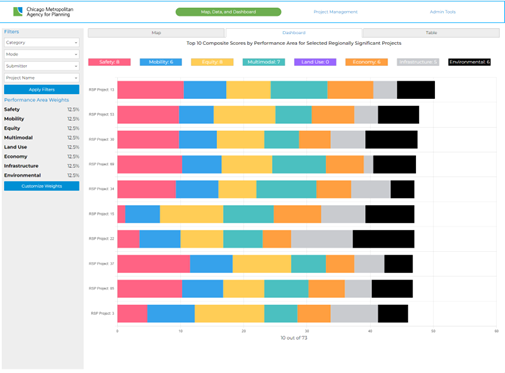 To support the Chicago Metropolitan Agency for Planning (CMAP) in its effort to expand its data-driven project prioritization process, High Street developed a series of digital tools to help CMAP wrangle project data, score candidate project performance, and analyze the project scores using charts, maps, and tables. The TPAT is an Esri-based system composed of custom ArcGIS Pro geoprocessing tools, an Operations Dashboard, and an Experience Builder web application. High Street developed custom functionality to allow CMAP to adjust measure weights on-the-fly, visualize candidate project data in the browser, and manage candidate project information.