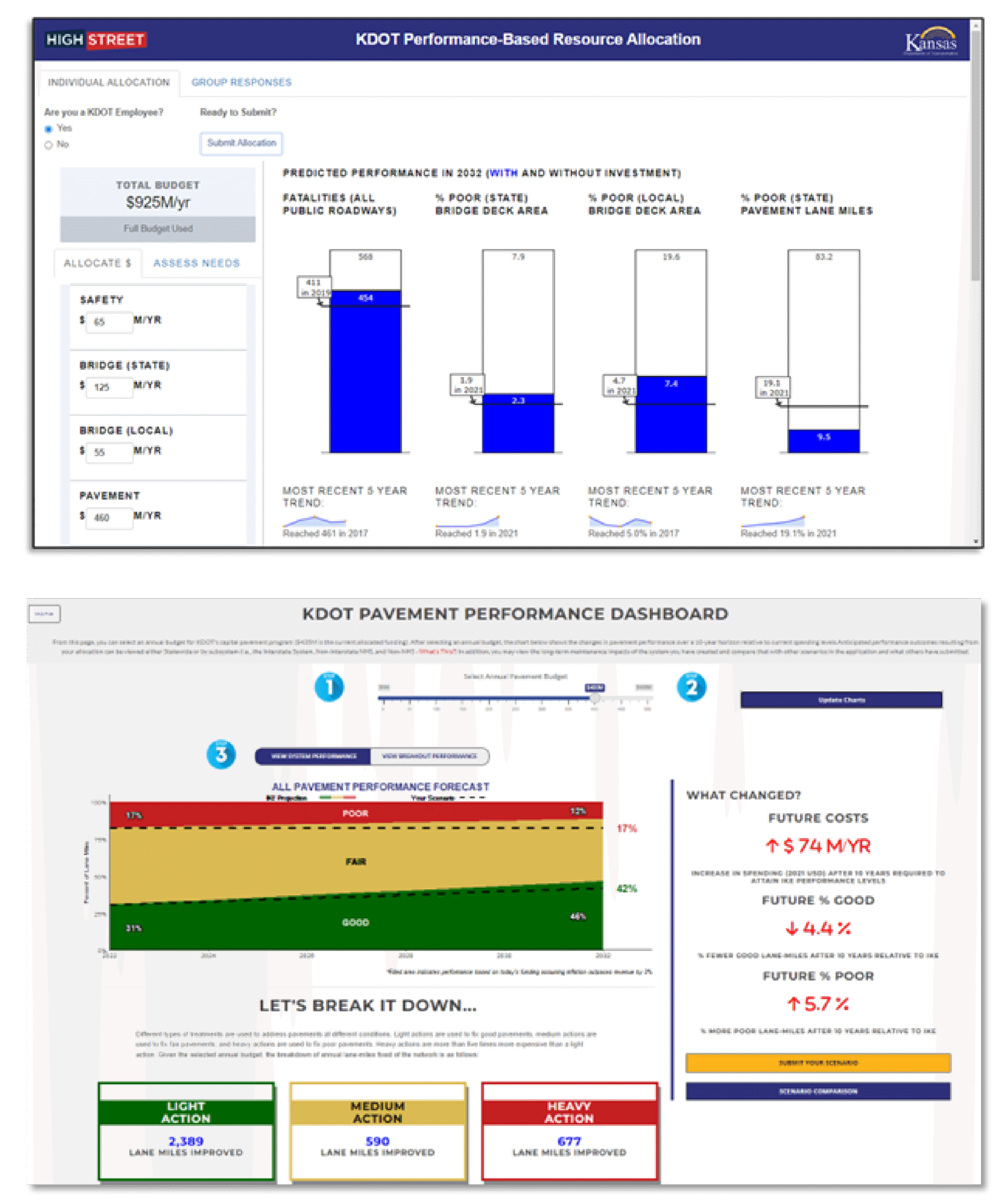 The success of this effort led to a follow-on activity to create a statewide dashboard that enabled exploratory tradeoff analysis of statewide metrics spanning pavement, bridge, safety, mobility, and multimodal performance. High Street brought this interactive web tool to a leadership meeting to engage KDOT staff on their allocation preferences and to assess the anticipated minimum investment level to achieve desired performance outcomes. Results were captured in real-time at a workshop and used as a discussion point to help build consensus around mid-range investment strategies.