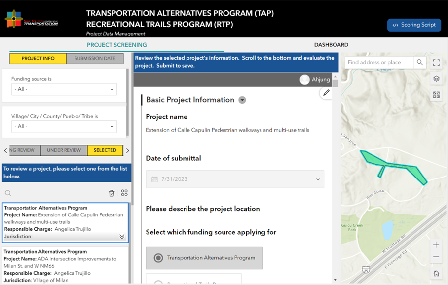 High Street has developed an online submission and management system for federal grant application programs administered by the New Mexico Department of Transportation (NMDOT). The online system modernizes the grant application, pre-screening, and project selection processes, replacing a cumbersome PDF-based prior process. New submissions trigger automatic notifications to program coordinators, guiding them to a secure application to review submitted projects, assign screened projects to the program committee for scoring and recommendations. The scoring results are summarized into an administrative dashboard.