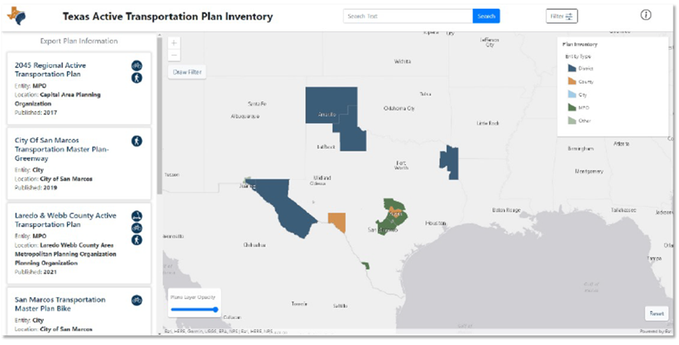 To improve awareness and utilization of existing active transportation plans, High Street worked with TxDOT to create a self-service statewide inventory of plans and an intuitive user interface to quickly access plan information. This tool created a centralized, map-based online inventory of all active transportation plans in Texas to enable easy access to these planning documents, appropriately incorporate bicycle and pedestrian infrastructure into project planning and scoping and facilitate the development of safe bicycle and pedestrian networks. The Active Transportation Plan Inventory is comprised of three components: 1) an online submission portal, 2) a management portal where TxDOT staff can approve or modify plans, and 3) the tool’s public-facing website where users can search, filter, and browse active transportation plans in Texas.